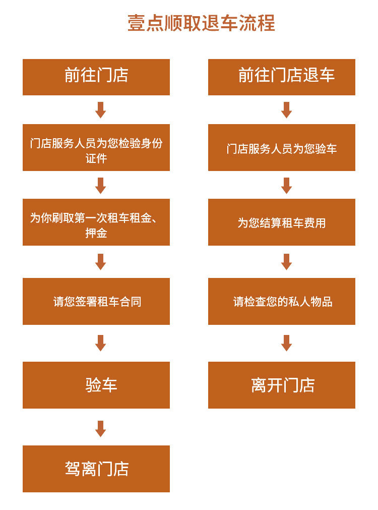 1、離開門店前,請(qǐng)先熟悉租用車輛的安全性能,危險(xiǎn)警示燈、門鎖、門頭以及備胎。 2、壹點(diǎn)順汽車接受信用卡及國內(nèi)借記卡支付。 3、取車時(shí),請(qǐng)根據(jù)您租車的車型,收取相應(yīng)的租金或押金。 4、還車時(shí),留取2000元違章押金,15日后,無違章自動(dòng)轉(zhuǎn)賬退款,如有違章,自己處理或代辦。